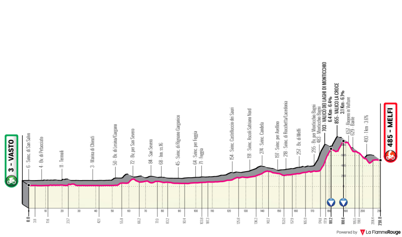 Etappe 3 is een 216 km lange etappe van Vasto tot Melfi. De etappe is opgedeeld in twee stukken met eerst 170 km aan vlakke en glooiende wegen met op 107 km een tussensprint. Na 170 km zullen de renners beginnen aan de eerste beklimming van de dag wat een beklimming is van de 3de categorie met een lengte van 6,3 km en gemiddeld stijgingspercentage van 6,3%. Na een afdaling van de Valico Dei Laghi Di Monticchio krijgen de renners nog een korte beklimming van 2,6 km voor de kiezen met een gemiddelde stijging van 7,6%. Op de top is het nog 25 km naar de finish waarvan het grootste deel in dalende lijn. De laatste paar honderd meter lopen nog wel vies omhoog aan een 5%. De renners zullen om 10:30 starten in Vasto en finishen rond 17:00 in Melfi.
