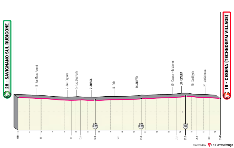 Na het verlaten van de Alpen bij Bassano del Grappa, rijden de renners door het vlakke landschap van Venetië naar de Adriatische kust. De etappe eindigt in Caorle, na een tocht van 197 kilometer. Hier zullen de renners naar verwachting strijden om de zege in een spectaculaire sprint door de straten van het stadje.