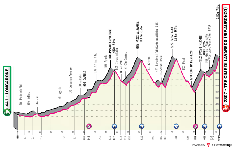 De eerste helft van de etappe voert de renners langzaam maar zeker naar de voet van de Passo Campolongo, waar de top halverwege het parcours ligt. Na de Passo Campolongo gaat het omhoog en omlaag over de Passo Valparola, Passo Giau en Passo Tre Croci voordat de renners aan de laatste klim beginnen. De klim naar Tre Cime di Lavaredo is goed voor 7,2 kilometer tegen een gemiddelde stijging van 7,6%, met in de laatste 4 kilometer een stijgingspercentage van dubbele cijfers.