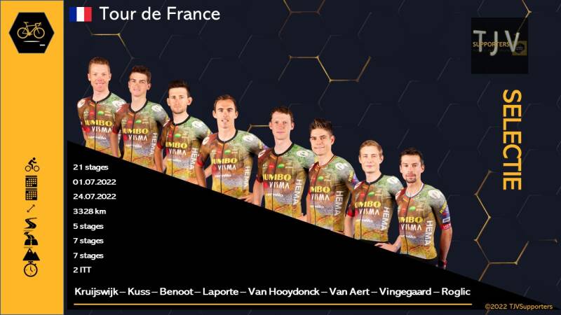 Beide kopmannen krijgen K2 mee als super-knechten, Kruijswijk en Kuss. De eerste was ijzersterk in de Dauphiné, de tweede moest helaas vroegtijdig uit de Ronde van Zwitserland stappen terwijl hij er op dat moment goed voorstond. De klimtrein mist dit jaar wel 1 of 2 wagons, omdat Wout van Aert vol mag gaan voor etappezeges en de groene trui. Hij krijgt daarvoor als secondanten Van Hooydonk, Laporte en Benoot mee; die laatste zal ook in het hooggebergte nog wel een paar colletjes meekunnen. Geen plaats dus voor Gesink of Theunissen, en zelfs niet voor de vooraf als