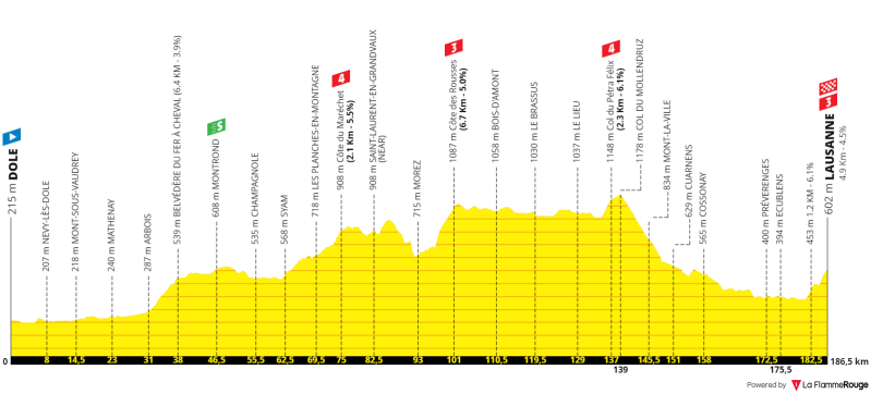De Tour de France was voor het eerst in Lausanne in 1948, dat werd een zege voor Gino Bartali. Naast een aantal start organiseerde de Zwitserse stad viermaal een finish deze waren in 1949, 1952, 1978 en 2000. De laatste twee kaar dat de renners in Zwitserland finishte wonnen Gerrie Knetemann en Erik Dekker. Het zou dus zomaar kunnen dat de opvolger ook een Nederlander is. Na drie beklimmingen onderweg duiken de renners een lange afdaling in. Na de afdeling leidt een vlak gedeelte van 15 km naar de voet van de slotklim. De slotklim is een niet regelmatige klim met een afdeling waarna de weg weer stijgt met 1 km á 9,5%, waarna de slotkilometer nog eindigt met 3,4% oploopt. Is de opvolger van Erik Dekker, Mathieu van der Poel of kan Wout van Aert daar een stokje voor steken.