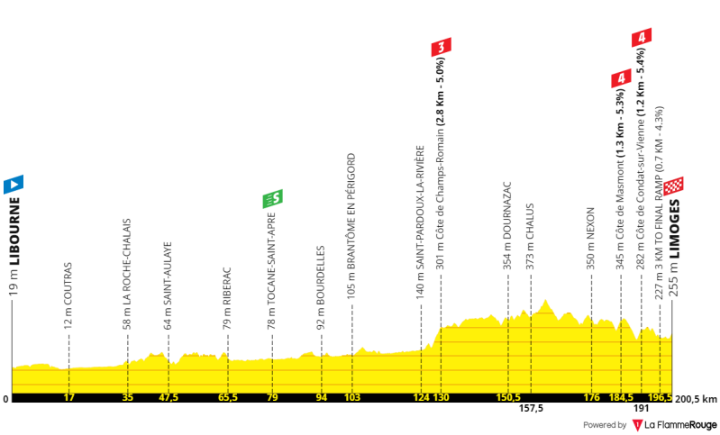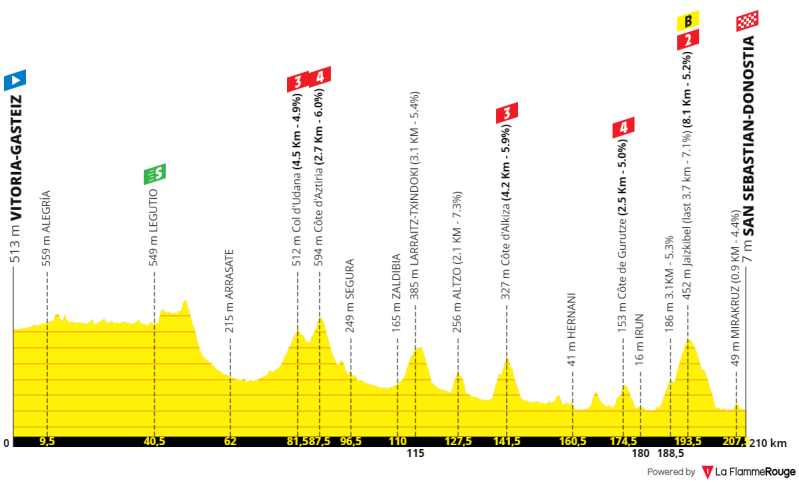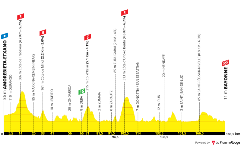 In de derde etappe verlaat het peloton het Baskenland. De eerste 100 kilometer zijn nog vrij pittig met vier klimmen, maar vervolgens is het op papier een stuk gemakkelijker. Het is alleen nog geen uitgemaakte zaak dat het vandaag een massasprint wordt. Op een kleine 20 kilometer van de finish in Bayonne ligt nog een pukkeltje, waarbij het toch één kilometer aan 7% omhoog gaat. De pure sprinters zullen dus vrezen dat andere sprintersteams de koers hard maken. De slotfase zal sowieso nerveus zijn, omdat er meerdere rotondes zijn. Wie gaat als eerste met zijn handen in de lucht in Frankrijk?