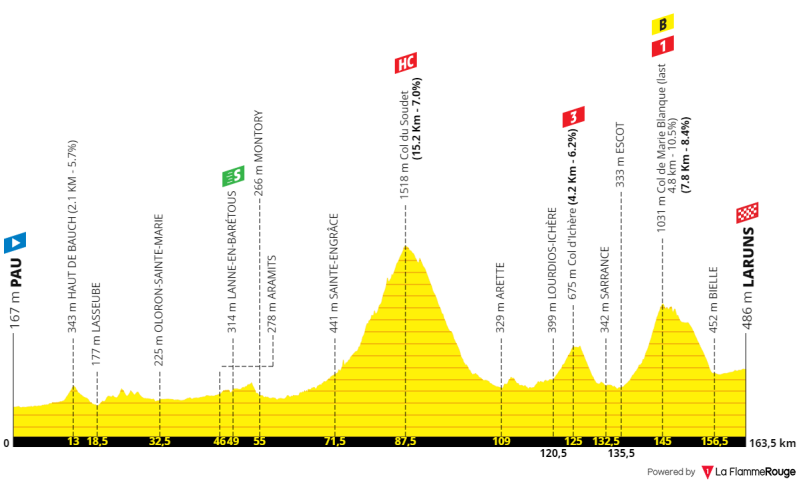 Vanwege de start in Noord-Spanje is het logisch dat de Tour de France van 2023 al heel snel de Pyreneeën aandoet. Op woensdag worden de eerste serieuze beklimmingen bedwongen. De Col du Soudet is het hoogste punt van de etappe tussen Pau en Laruns (15,1 km à 7%). Er is vandaag geen bergop finish, waardoor het de vraag is of vandaag de ritzege gaat naar een aanvallende klimmer of een pure klassementsrenner. De top van de Col de Marie Blanque ligt op 20 kilometer van de finish. In het tweede deel van deze klim komen de stijgingspercentages niet onder de 10%. Zijn de benen niet top, dan kun je hier zomaar je klassementsambities opzij zetten. In 2020 versloeg Tadej Pogacar hier onder andere Primoz Roglic in het groepje van vijf.
