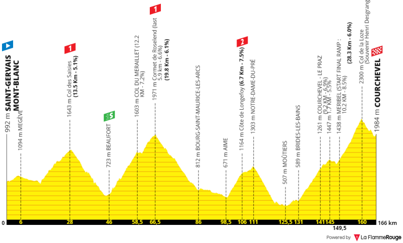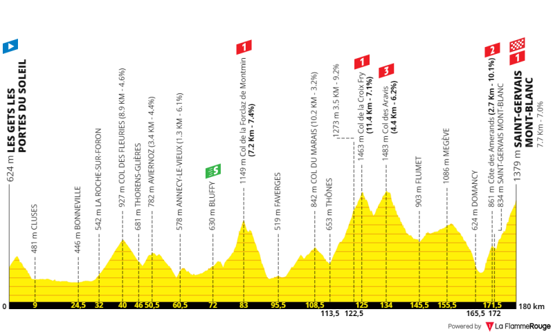 De laatste rit vòòr de tweede rustdag, en het is weer geen flauwe. Geen klim van de Hors Categorie, wel een 3e, een 2e en drie keer een 1e, met finish bergop in Saint Gervais Mont Blanc. Officieel 7 km aan 7,7% maar er zit een addertje onder het gras in de vorm van een col van 2e categorie, net voor het binnenrijden van Sant Gervais zelf: 2,7km aan maar liefst 11%! De laatste 4km van de eigenlijke slotklim gaan aan 9, 7, 9 en 10%. Hier zullen de klassementsmannen elkaar pijn willen doen, wetende dat de dag erna alles even tot rust kan komen.