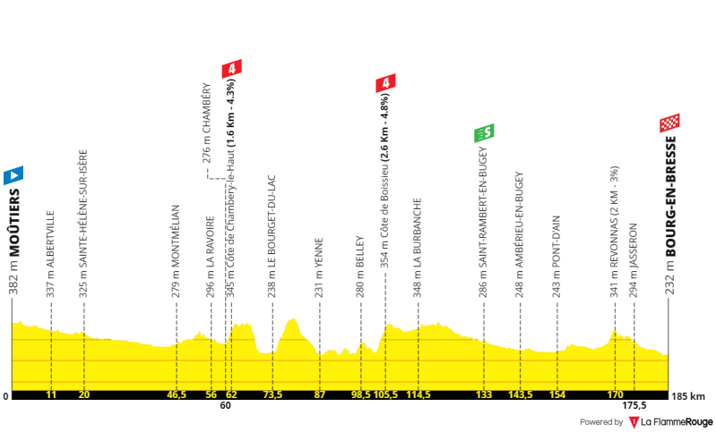 Er zullen er vandaag een paar opgelucht ademhalen: we laten de Alpen achter ons. We beginnen er nog middenin, in Moutiers, maar rijden vooral door dalen, via Chambery, naar Bourg-en-Bresse (tip: hier MOET je ooit het lokale kippen-ras gegeten hebben, zelfs langs de snelweg is deze onovertroffen!). De sprinters gaan vandaag gemakkelijk over de 2 hobbels van 4e categorie en zullen uitmaken wie er wint. Wedden?