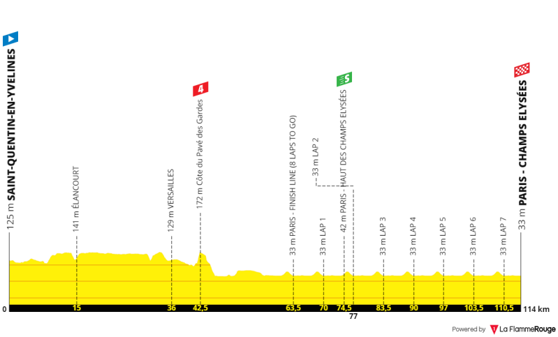 Saint-Quentin-en-Yvelines – Paris Champs-Elysées, 115km, namiddagcriterium (start om 16u30), rustig begin, belachelijk hoge snelheden op het eind, een sprinter die wint.