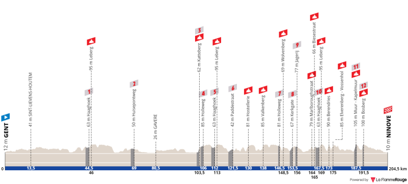 Na de ploegenpresentatie in het ‘Kuipke’ in Gent zullen de renners om 11:15 vertrekken voor een omloop van 204,2 km. Op iets meer dan 100 km van het einde begint de koers echt met de Kattenberg en de Holleweg. Voor de finale is het verstandig op zo’n 55 kilometer voor het einde de TV aan te zetten, wanneer de renners de Wolvenberg opdraaien. Dit jaar zullen de kenners de Molenberg moeten missen, die door wegwerkzaamheden niet bereikbaar is. In plaats daarvan volgt er een combinatie van de Marlboroughstraat (900 meter aan 4,4%) en Biesestraat (800 meter aan 3,8 %). Dat is de aanloop richting het vertrouwde drieluik Haaghoek-Leberg-Berendries, dat volgt op 38 kilometer van de streep. Dit wordt besloten met het Vossenhol, op 31 kilometer van de aankomst. De ultieme finale bestaat natuurlijk uit de Muur van Geraardsbergen en de Bosberg op respectievelijk 17 en 12 kilometer van de streep die in Ninove ligt.