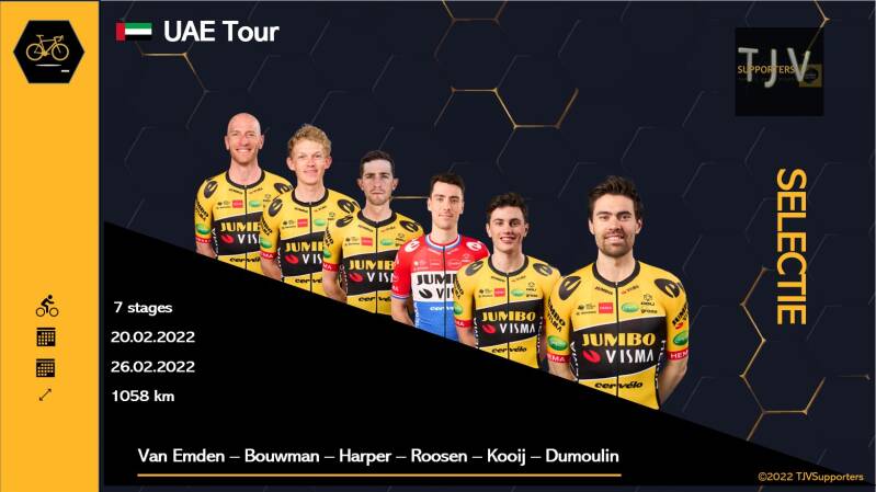 We gaan weer koersen! Van 20 tot en met 26 februari staat de eerste WorldTour-koers van 2022 op het programma. Evenals in 2021 is de UAE Tour de gelukkige om dit bal te openen. Voor veel renners betekenen dit de eerste wedstrijdkilometers van het jaar. Bij Team Jumbo-Visma Supporters warmen we je graag op voor de rittenkoers in de Verenigde Arabische Emiraten. Wie zijn de favorieten, wat zijn de kansen van onze geelzwarte brigade en op welke etappes kun je met smart naar uitkijken?