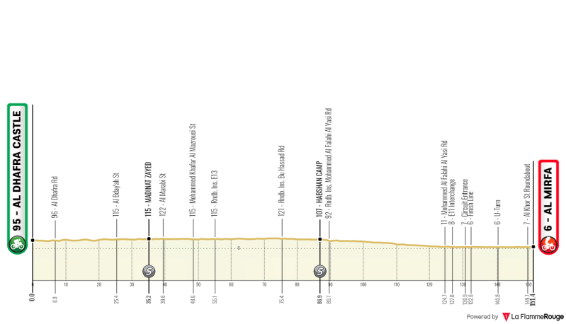 Zei er iemand sprinten? Ook vandaag gaat de etappe 99,9 % zeker in een massasprint eindigen. De vorige winnaars in Abu Dhabi Drinkwater waren Mark Cavendish en Caleb Ewan. Wie volgt hun op?