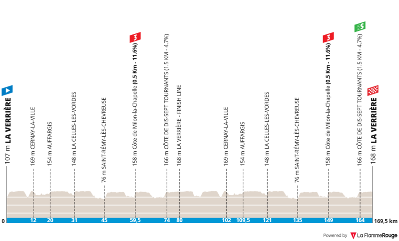 geaccidenteerd, met 2 klimmetjes van de 3 e categorie, en nog veel meer ongeklasseerde