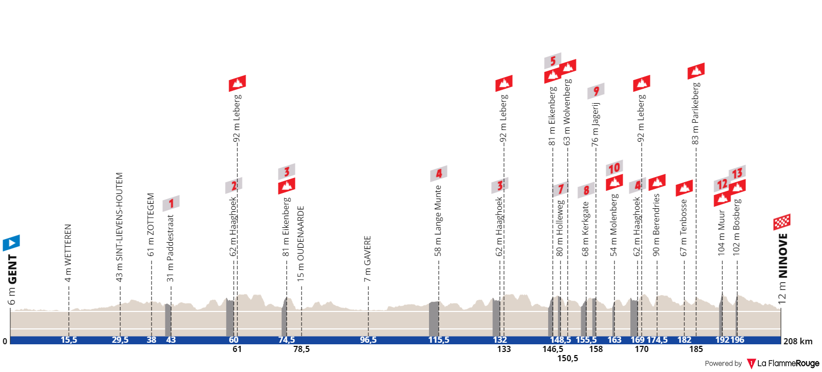 - De grootste verandering bevindt zich in de laatste 40 kilometer. Na de Berendries volgen nu direct de Tenbosse en de Parikeberg. Deze toevoegingen moeten de koers openbreken nog voordat de iconische combinatie van de Muur van Geraardsbergen en de Bosberg wordt bereikt.